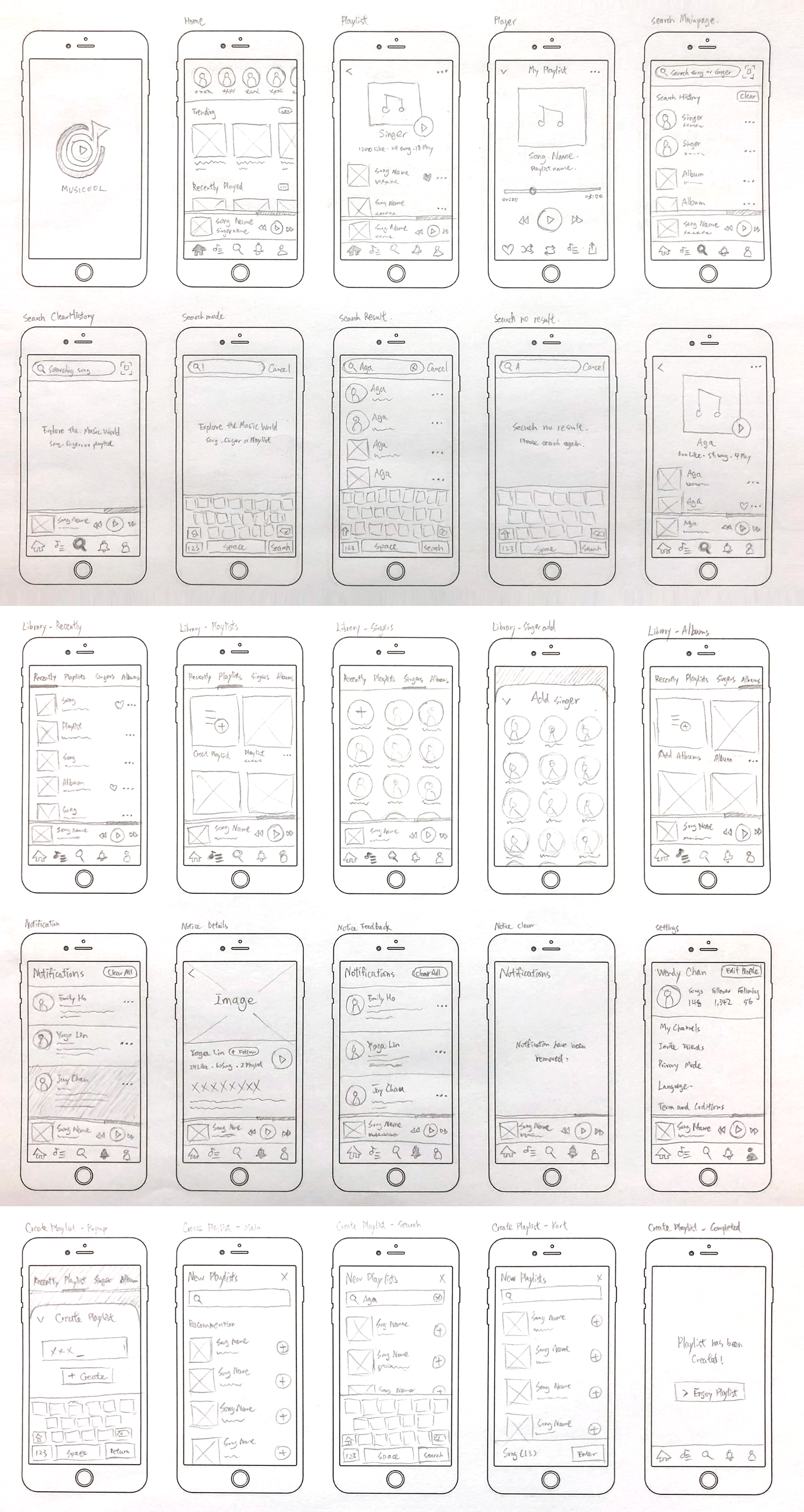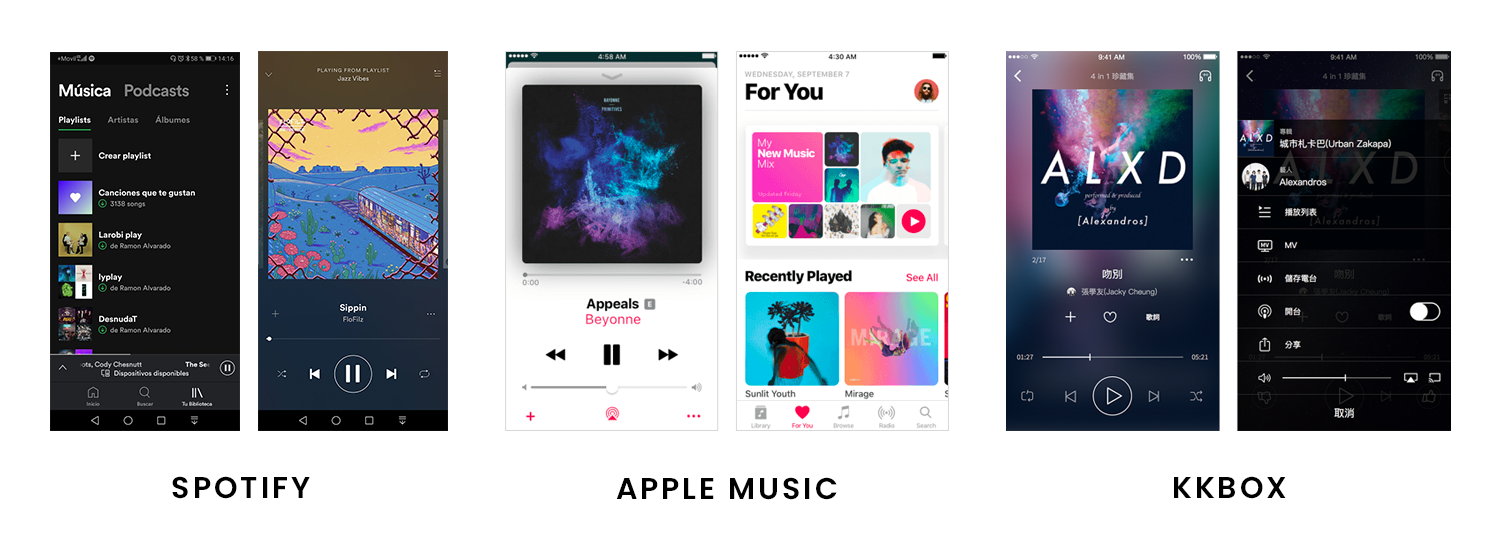 To learn more about the general features of the music app,a research of some popular music stream app: Spotify, Apple music and KKbox have been done. I tried to adjust the disadvantage of them and advance the music app in order to fit the user need.