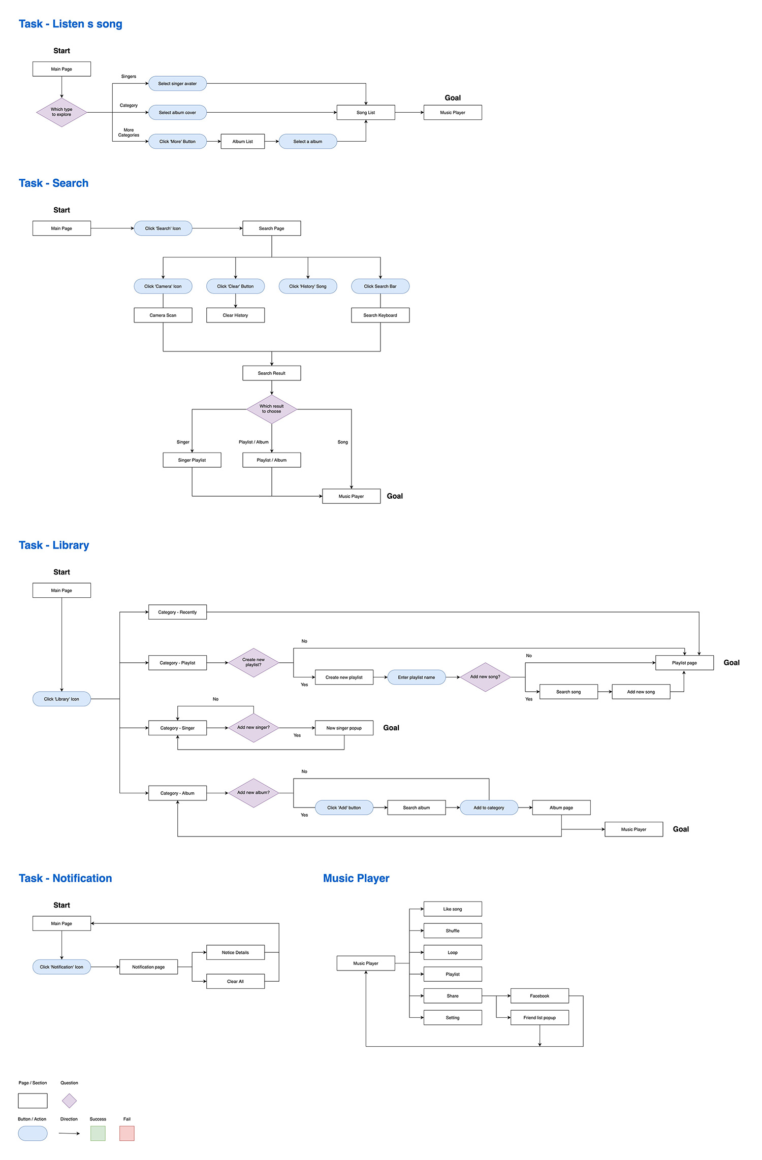 The task flow detail the various decisions the users make as they navigate the app based on the scenarios, and straightforward flows of the users as they would navigate the app in order to satisfy the tasks and scenarios.