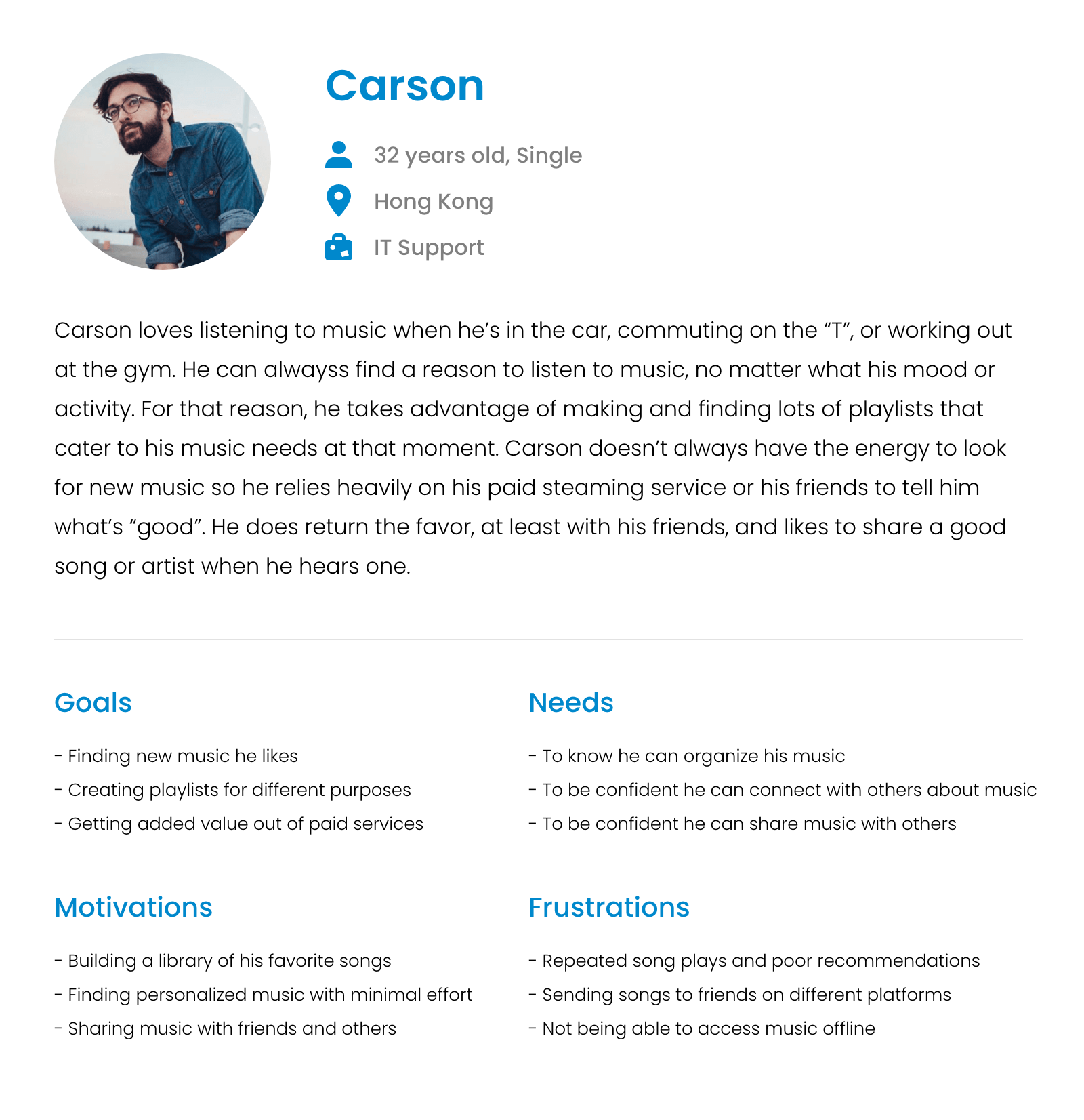 After searching and analyzing data on the Internet, I explored the behavior and psychology of users of several music applications, and I created a persona (Carson) as a target of the project. He loves discovering new music with minimal effort.